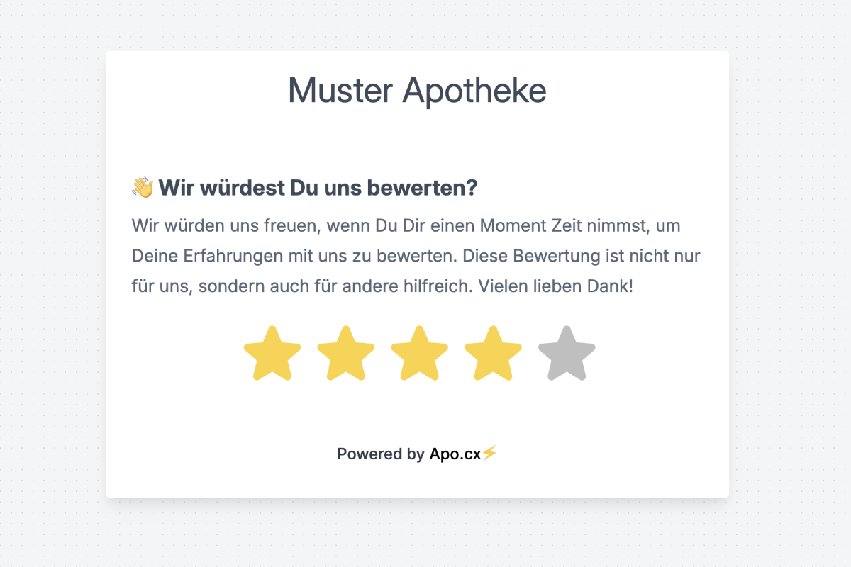 Mit Apo.cx erhältst Du regelmäßige, detaillierte Auswertungen und Zugriff auf unsere API. Optional kannst Du auch „Powered by Apo.cx” ausblenden und das Design der Feedback-Formulare per CSS anpassen, sodass sie optimal zum Look & Feel der Website Deiner Apotheke passen. Und dank unseres einfachen Schritt-für-Schritt-Onboardings kannst Du schnell durchstarten.