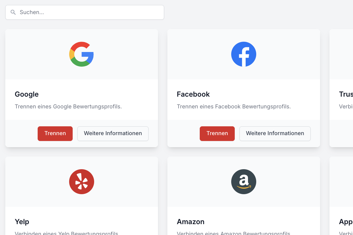 Apo.cx unterstützt derzeit zwölf verschiedene Plattformen. Dazu gehören Google Business Profile, Facebook, Gesund.de, Trustpilot, Yelp, der Google Play Store und der Apple App Store. Du hast außerdem die Möglichkeit, eigene Plattformen einzubinden.