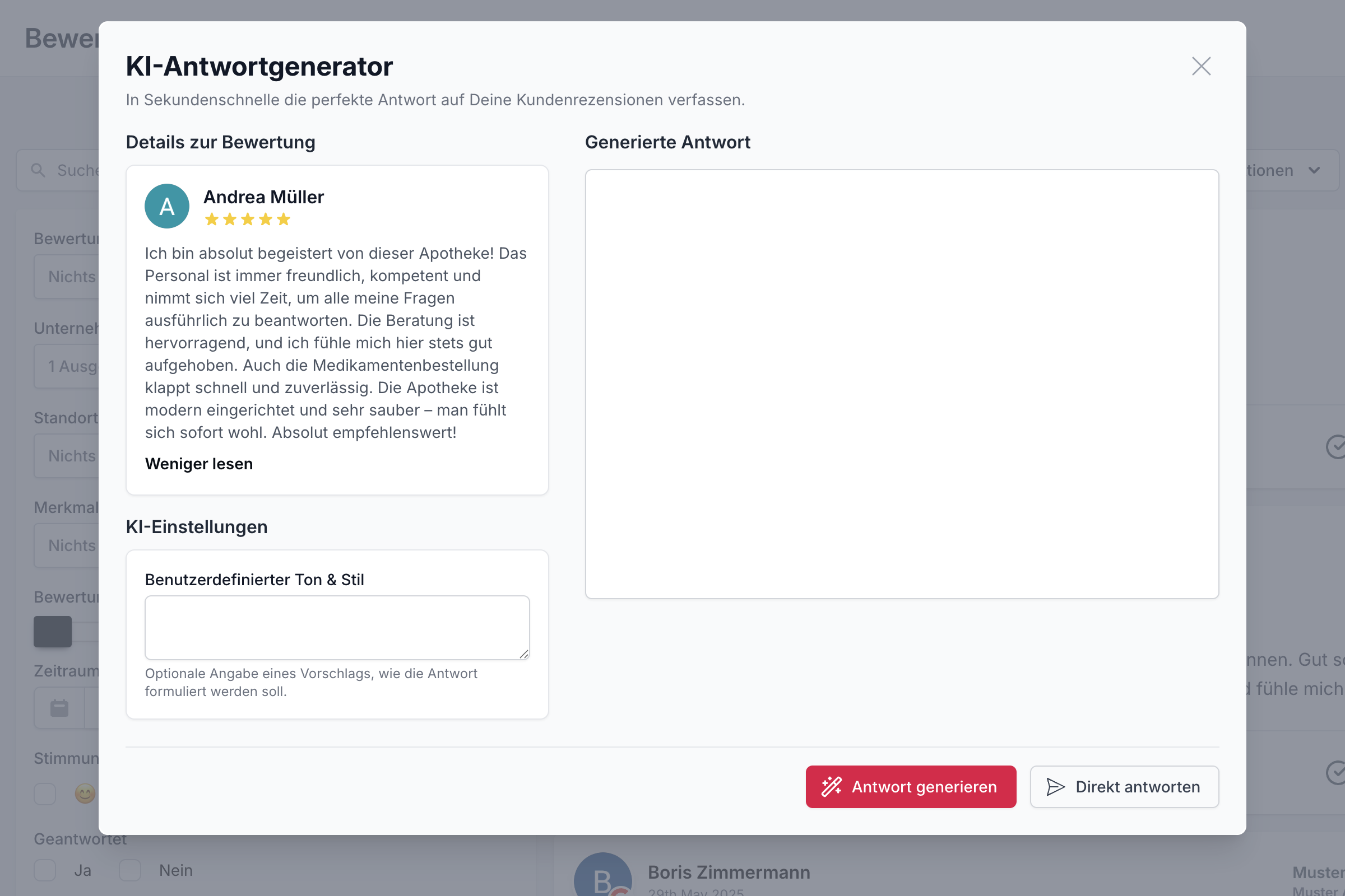 Du kannst auf Bewertungen entweder manuell oder per KI antworten. Du hast sogar die Möglichkeit, sie automatisch beantworten zu lassen. Darüber hinaus stehen Dir eine Stimmungsanalyse, eine automatische Spracherkennung und benutzerdefinierte KI-Prompts zur Verfügung.